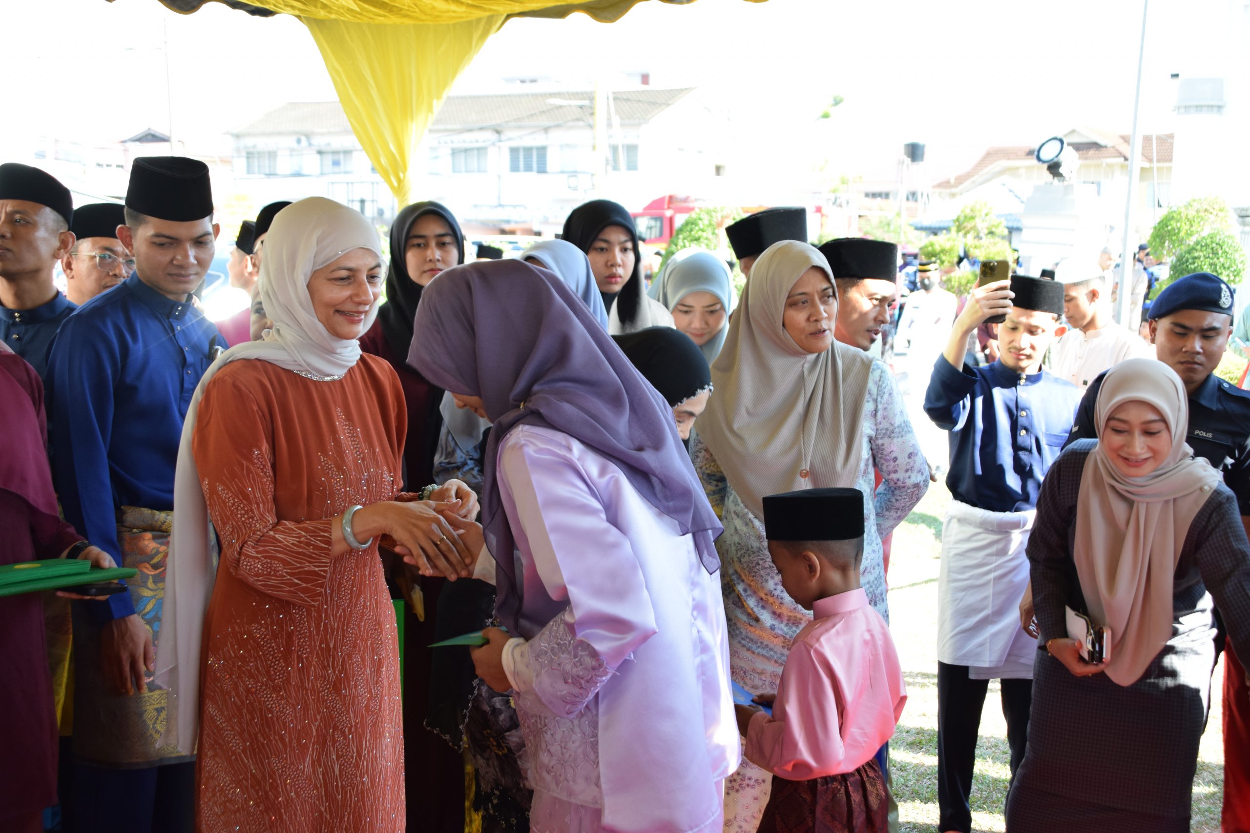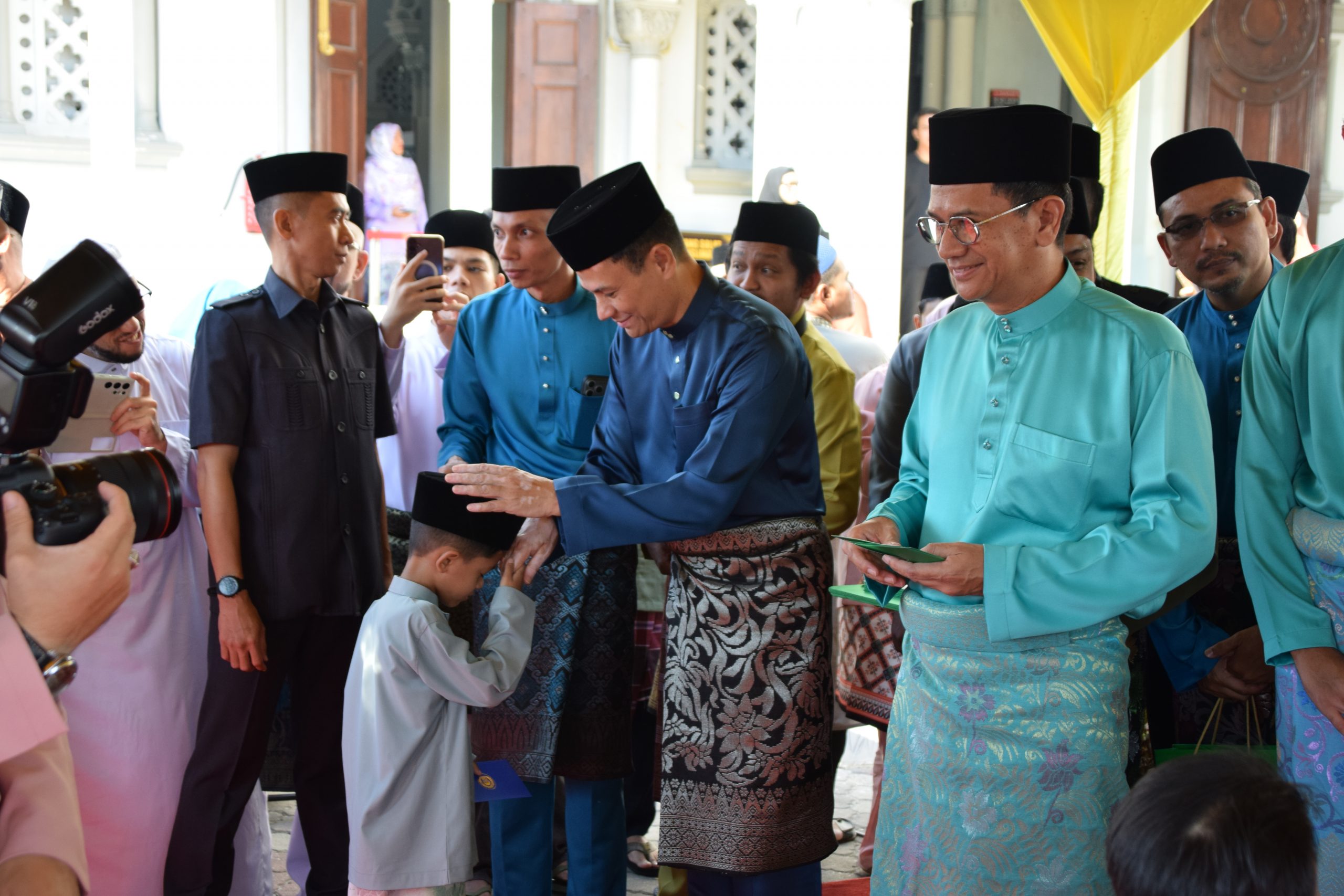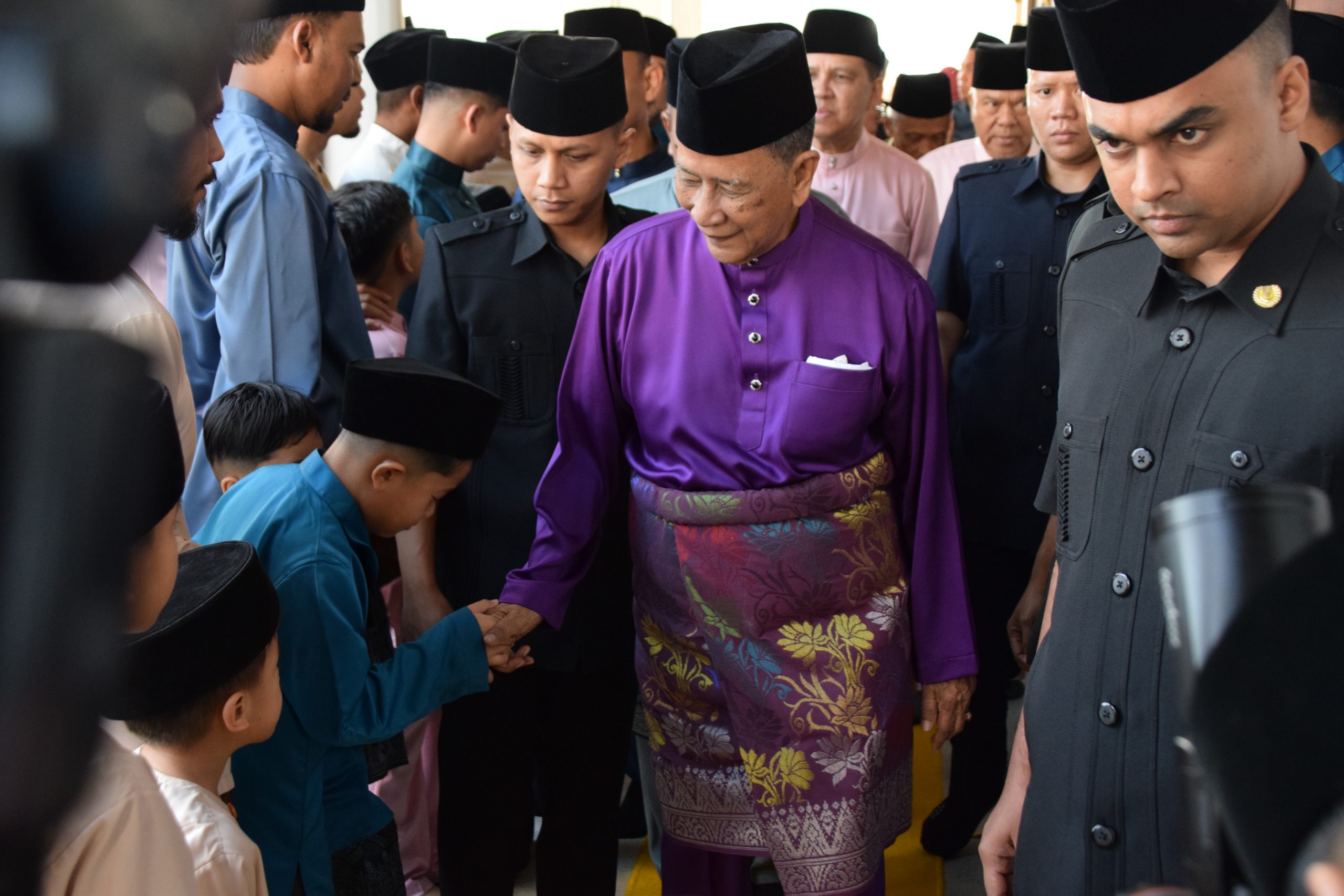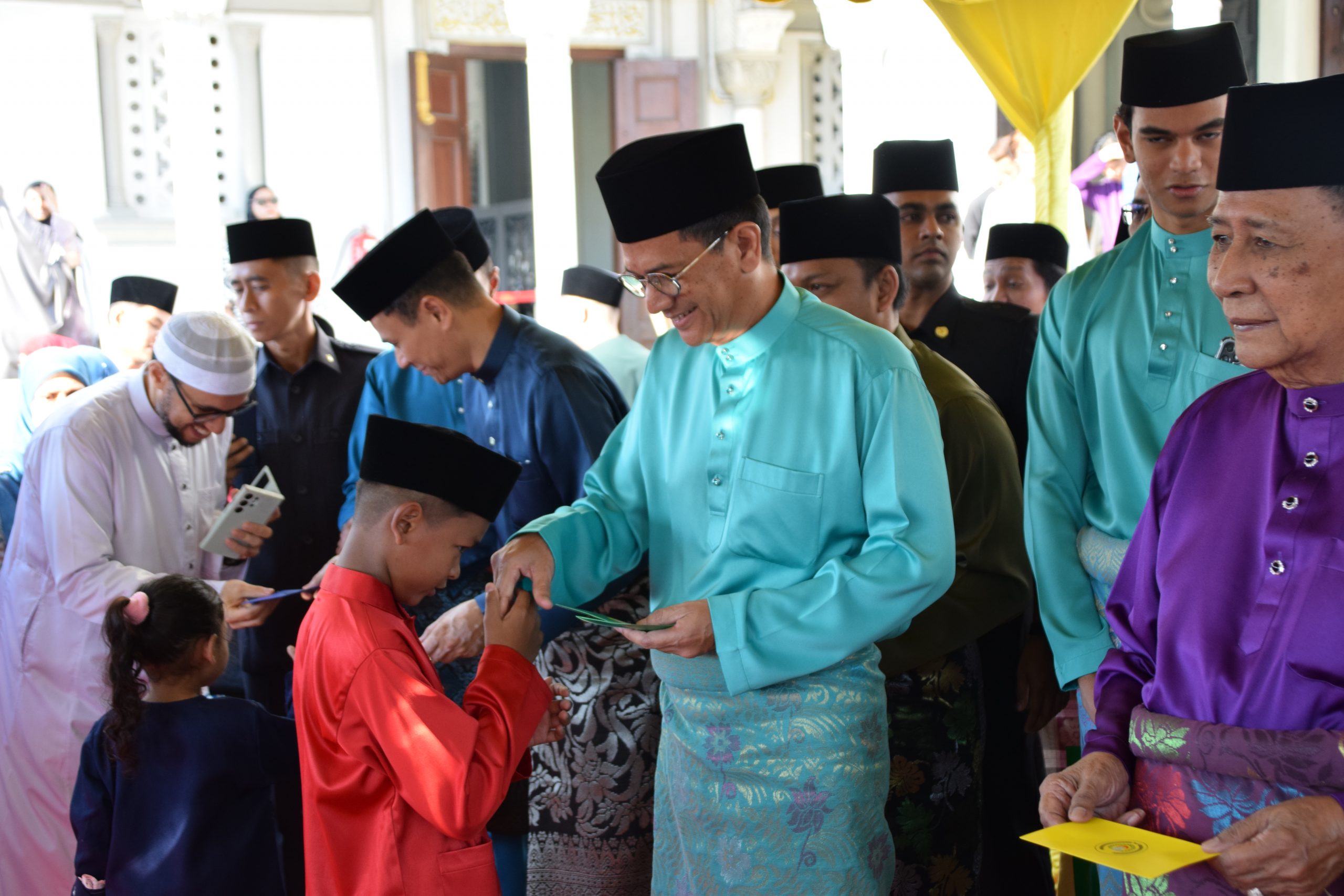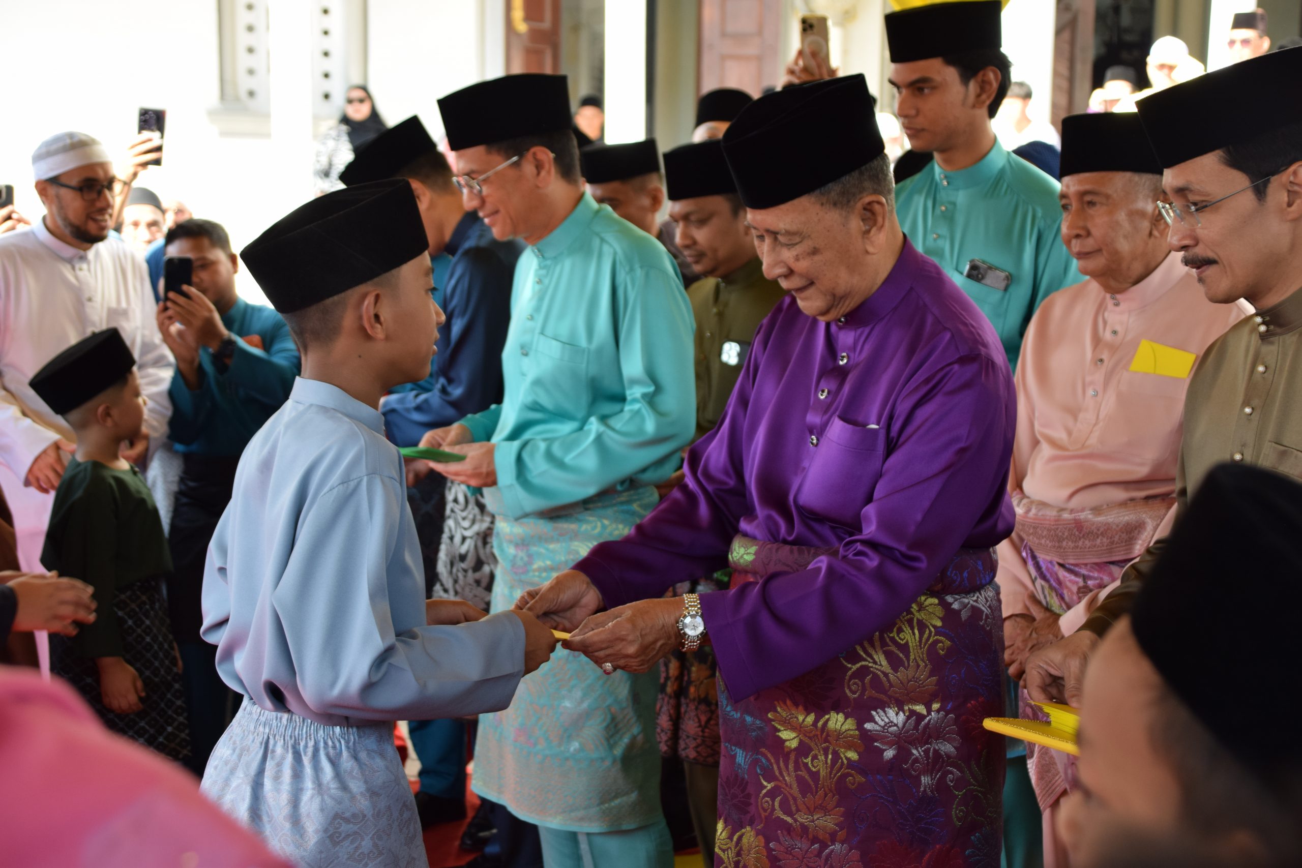 Selesai khutbah, Baginda Tuanku bercemar duli mengurniakan duit raya kepada kanak-kanak yang hadir sebelum berangkat pulang.